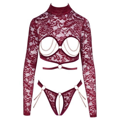 Indulge in a world of seduction with the Abierta Fina Open Red Lace Body, a tantalizing set designed to captivate and allure. This exquisite ensemble features an open-cup top with long sleeves and a daring crotchless thong, beautifully crafted from delicate dark red lace that exudes sensuality.
