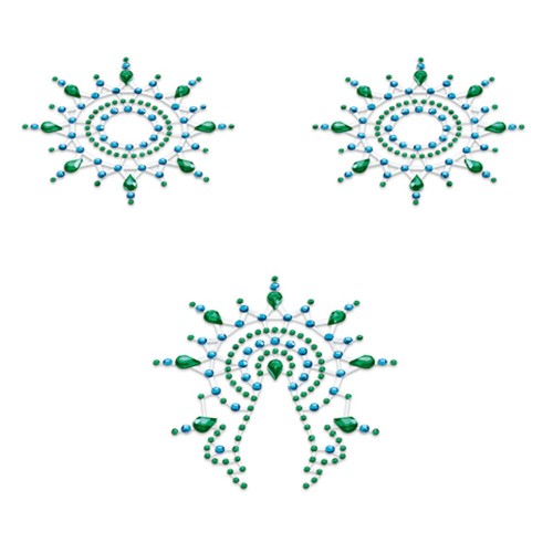 Introducing the Gloria Nipple And Vagina Pasties from Petits Joujoux, a glamorous accessory that elevates your allure with its dazzling array of jewellery crystals in stunning green hues. This enticing set is designed to bring a spark of eroticism to your bare skin, ensuring you stand out in any setting.